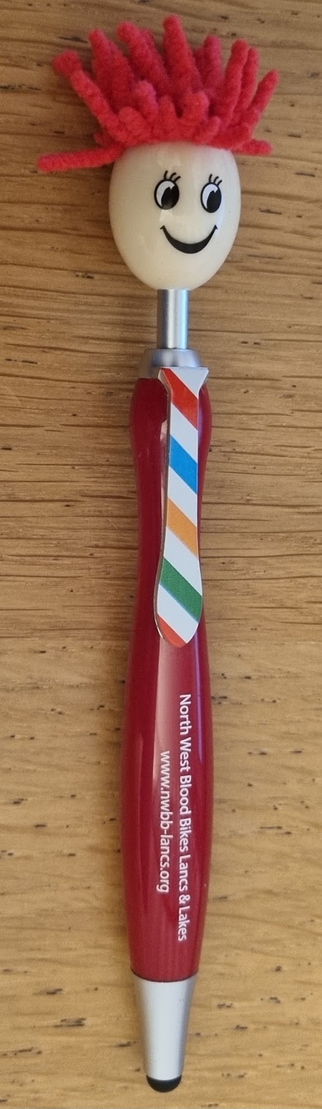Mop top pen with soft rubber stylus featuring charity name and website address
